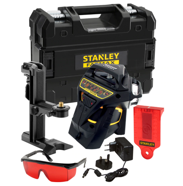 Im Lieferumfang enthalten: Ladegerät, Target, Brille, FATMAX-Magnethalterung, PRO-STACK-Transportkoffer, interaktives Handbuch mit QR-Code, einstellbarer Magnethalter FATMAX, Sicherheitshandbuch, Bedienungsanleitung.