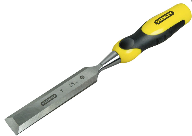 Bi-Material-Griff aus steifem Kunststoff und Polypropylen mit Stahlenden zum Arbeiten mit einem Hammer und zur Erhöhung der aufgebrachten Kraft.